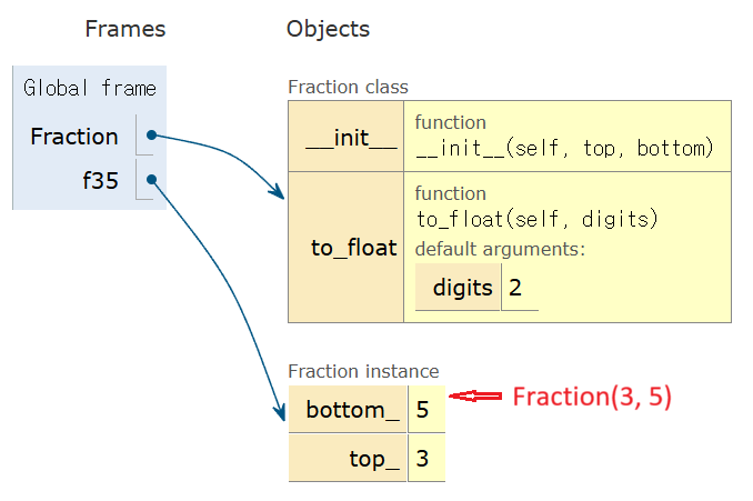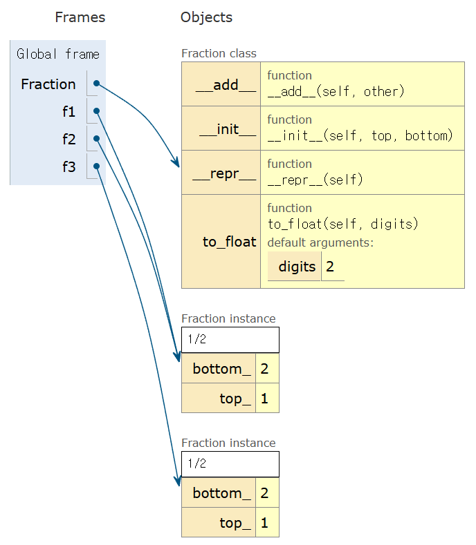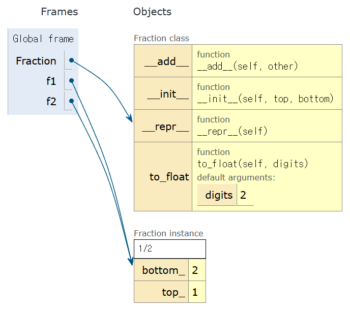 속성과 메서드 함수를 추가하는 방식으로 Fraction 클래스의