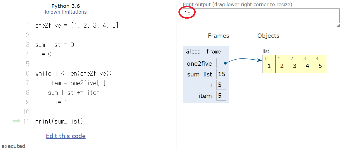 sum_list는 모든 항목이 더해진 상태인 15를 가리킨다.
