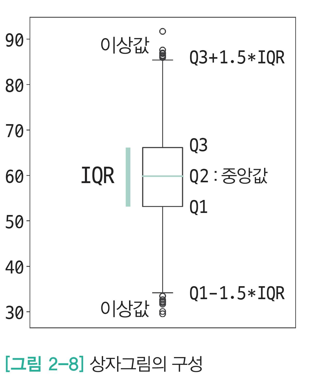 사분범위interquartile range는 제3사분위수에서 제1사분위수를 뺀 값으로서, 평균값을 중심으로 50%의 데이터가 모여있는 구간의 길이를 나타낸다.