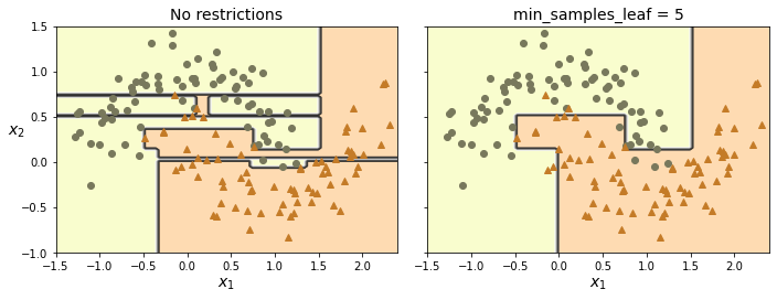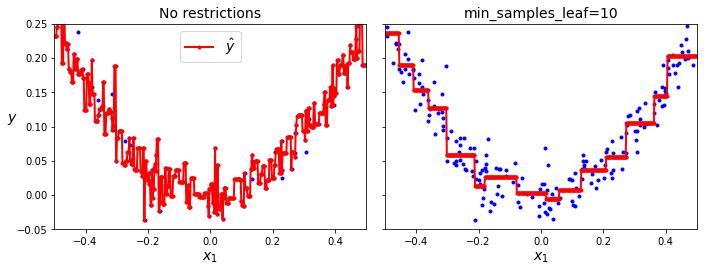 아래 왼쪽 그래프는 규제없이 훈련되어 훈련셋에 과대적합된 결정트리의 예측값을 보여준다.