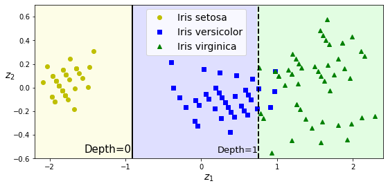 PCA 기법은 간단하게 말해 데이터셋을 회전시켜서 특성들 사이의 연관성을 약화시키며, 이를 통해 결정트리의 학습에 도움을 줄 수 있다는 정도만 여기서는 언급한다. 예를 들어, PCA 기법으로 회전시킨 붓꽃 데이터셋에 분류 결정트리를 훈련시킨 결과는 다음과 같다.