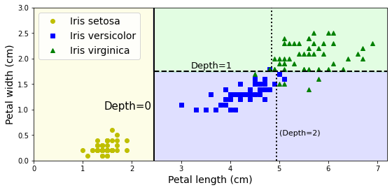 max_depth=3으로 지정해서 학습된 결정트리의 결정경계를 그래프로 그리면 다음과 같다.