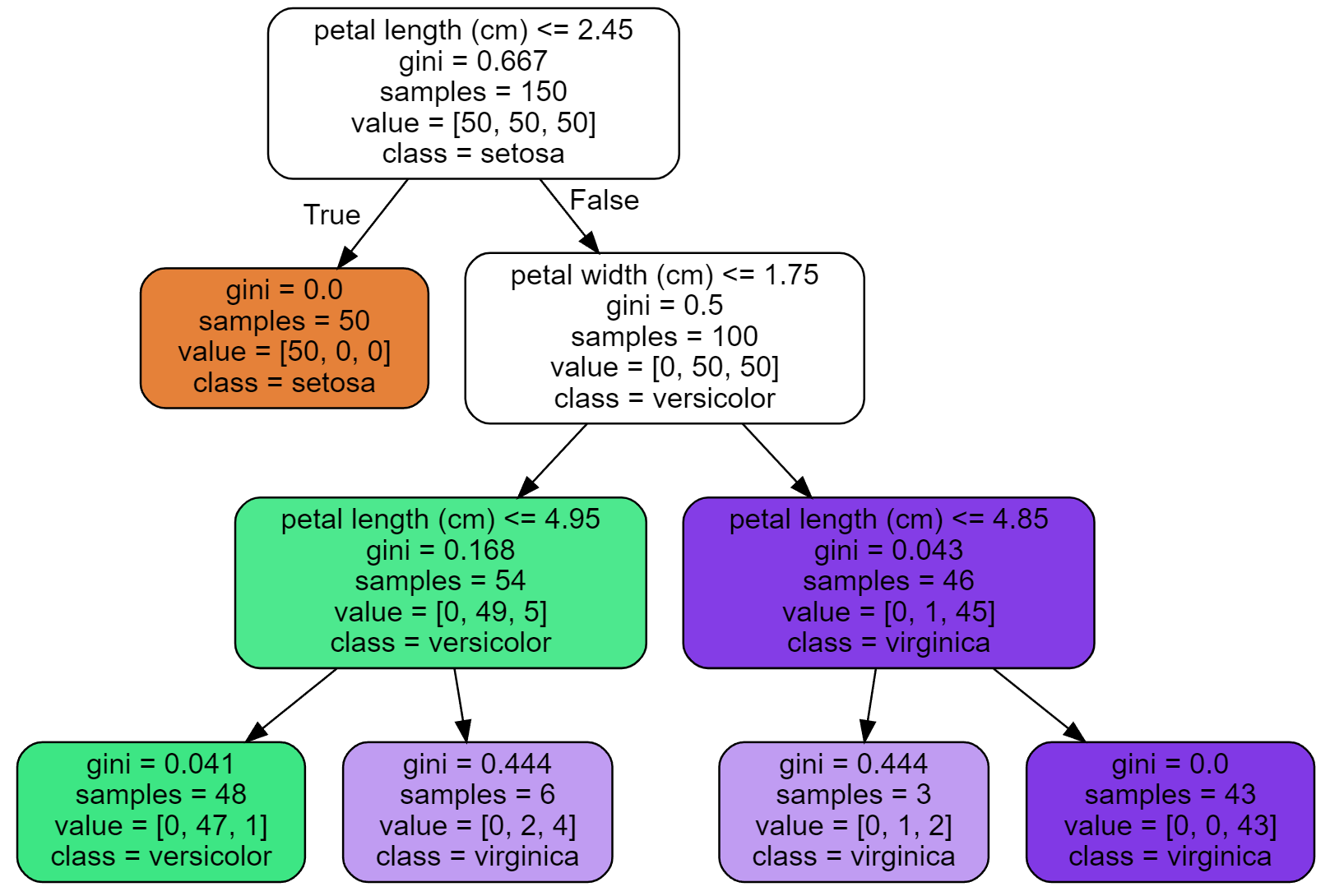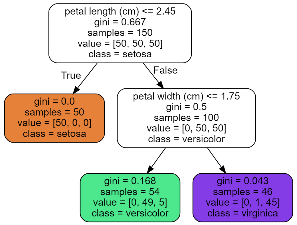 반면에 깊이 1의 왼편 노드 에는 세토사 품종 55개만 포함되어 있어서 지니 불순도가 0이다.