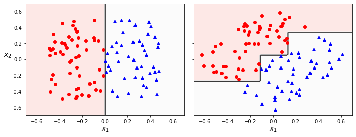 먼저 결정트리는 항상 축에 수직인 분할을 사용한다. 따라서 훈련셋에 회전을 조금만 가해도 결정 경계가 많이 달라진다. 예를 들어 아래 오른쪽 그래프는 왼쪽 데이터셋을 45도 회전시킨 훈련셋으로 학습된 결정트리이며 쓸데없이 계단 형식의 굴곡이 있는 결정경계를 갖는다.