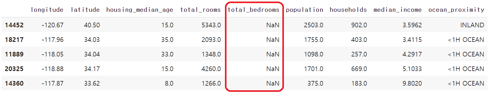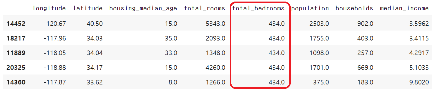 housing.dropna(subset=["total_bedrooms"], inplace=True)나. 결측치가 포함된 특성 자체 제거