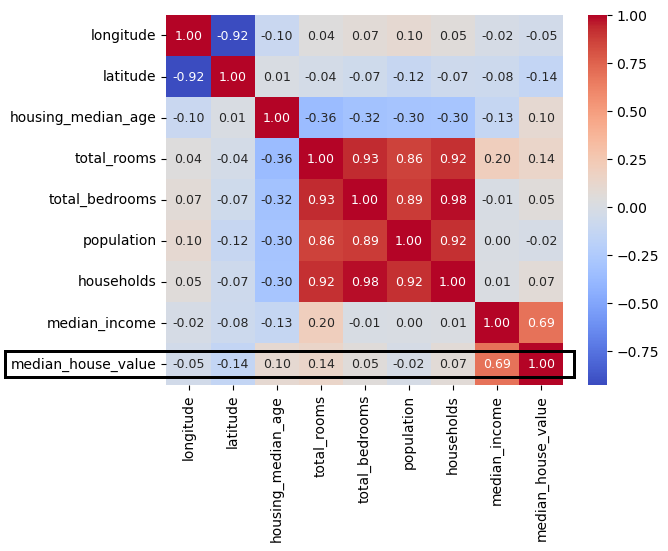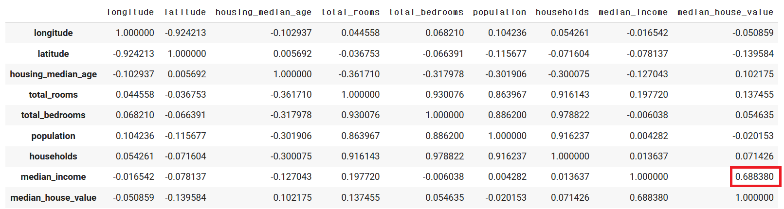앞으로 훈련시킬 모델은 어떤 구역의 중위 주택 가격을 제외한 다른 특성이 주어졌을 때 해당 구역의 중위 주택 가격을 예측해야 한다. 따라서 중위 주택 가격과 상관관계가 높은 특성을 미리 확인해보아야 한다.