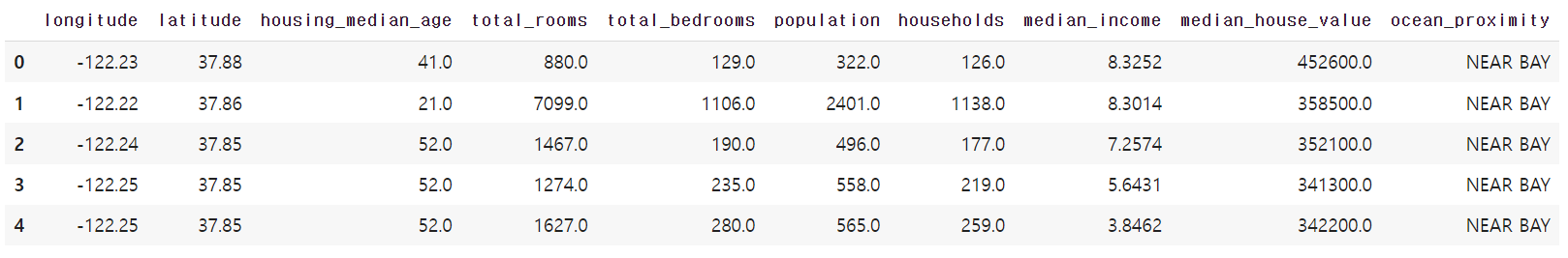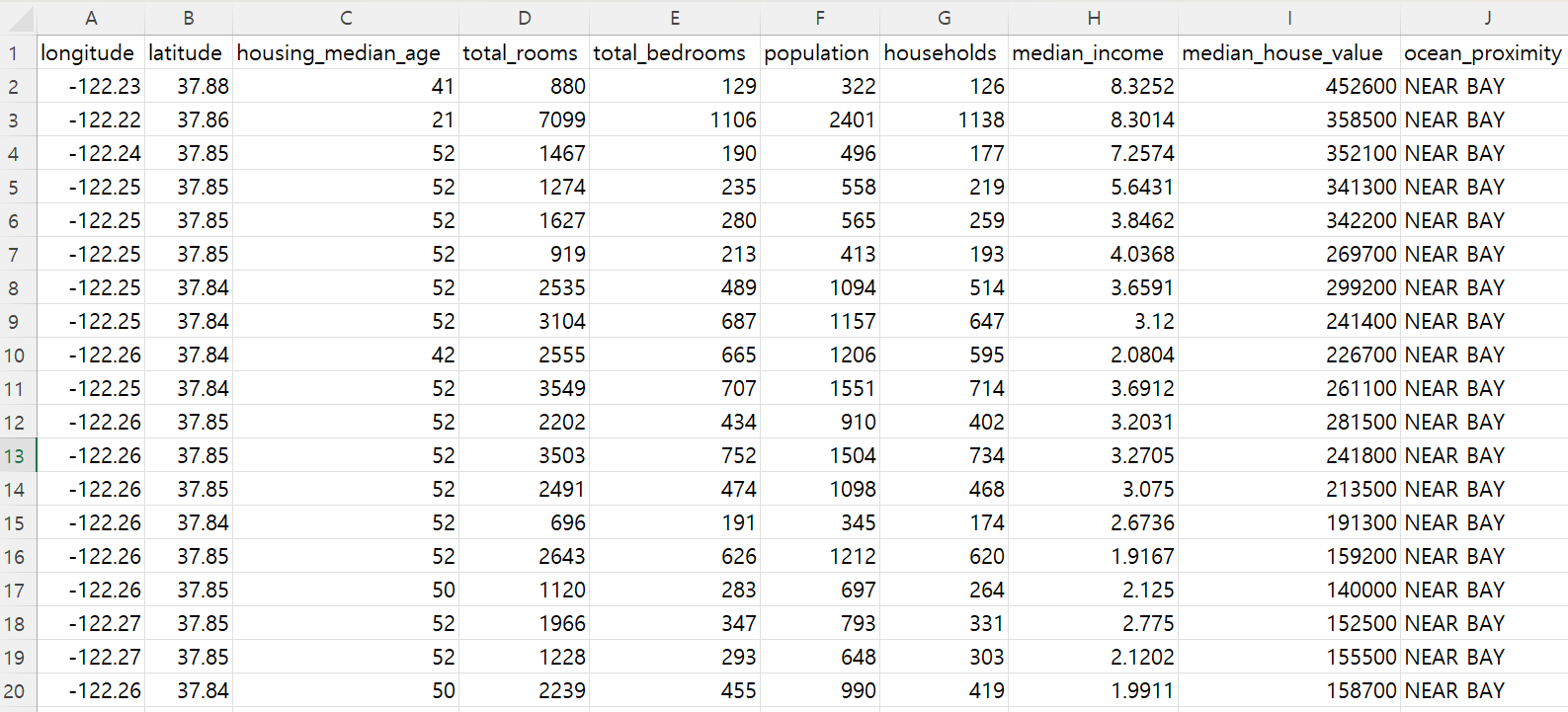 1990년도에 시행된 미국 캘리포니아 주의 20,640개 구역별 주택 가격 데이터는 위 엑셀 파일 그림의 1번 행에 표시된 대로 경도, 위도, 주택 건물 중위연령, 총 방 수, 총 침실 수, 인구, 가구 수, 중위소득, 중위 주택가격, 해안 근접도 등 총 10개의 특성feature을 포함한다. 참고로 특성은 데이터프레임의 각 열에 사용된 이름, 즉 열별 데이터를 대변하는 이름이다. 통계 분야에서는 특성을 변수 또는 변인 등으로 부르지만 머신러닝 분야에서는 특성이라 부르는 게 일반적이다.