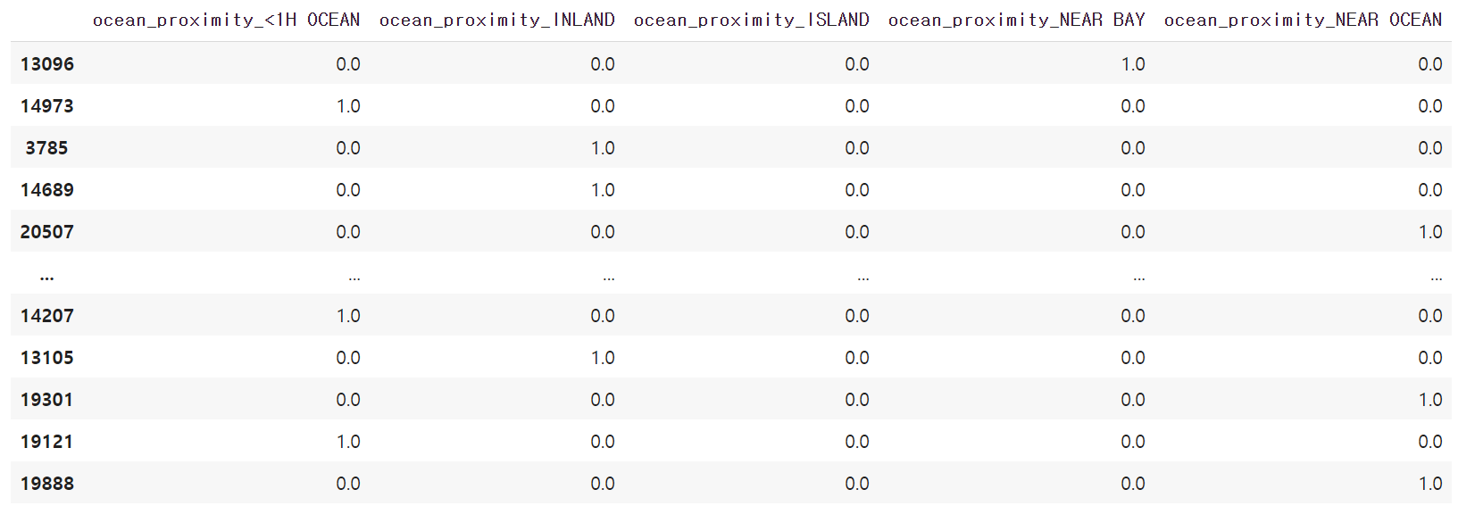 housing.drop("total_bedrooms", axis=1, inplace=True)(3) 해안 근접도 특성에 대해 원-핫 인코딩 대신 OrdinalEncoder 변환기 객체를 적용할 경우 훈련된 모델의 성능이 어떻게 달라지며, 성능의 차이에 대한 근거를 추정하라.