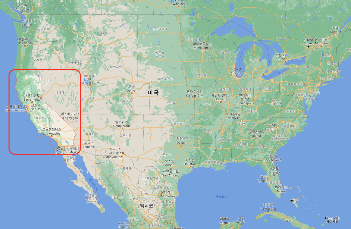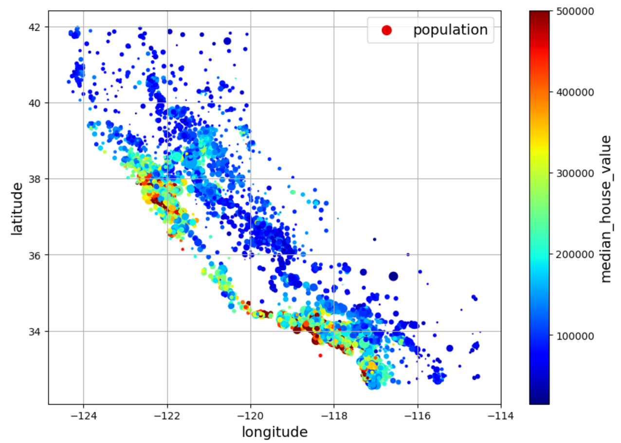데이터 시각화는 히스토그램, 산점도 등 다양한 방식으로 가능하다. 여기서는 데이터셋에 포함된 경도와 위도 정보를 이용한 시각화를 진행한다. 점의 클 수록 해당 구역의 인구가 많음을 의미한다.