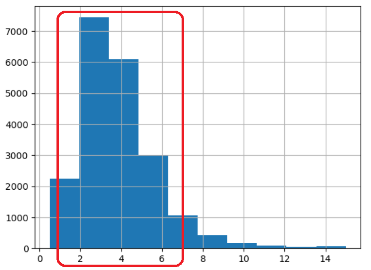 먼저 구역별 중위소득 특성을 대상으로 히스토그램을 그려보면 대부분 구역의 중위소득이 1.5 ~ 6.0, 즉 15,000에서 60,000 달러 사이인 것을 알 수 있다.