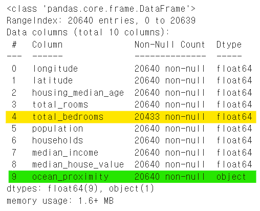 ocean_proximity (해안 근접도) 특성은 dtype이 object인데 이는 보통 문자열 자료형을 가리킨다.