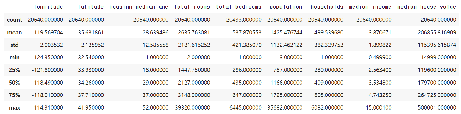 total_bedrooms특성은 207개의 null 값, 즉 결측치 포함.