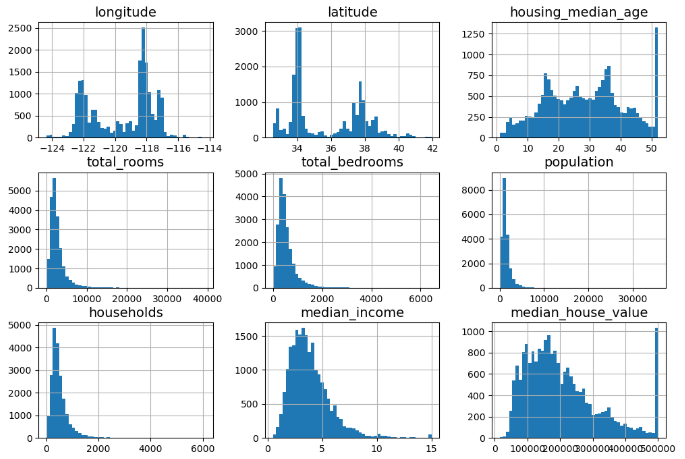total_rooms,total_bedrooms,population,households등의 특성값들이 오른쪽 꼬리를 길게 갖는다.일부 특성은 값의 크기를 제한한 것으로 보인다. 예를 들어