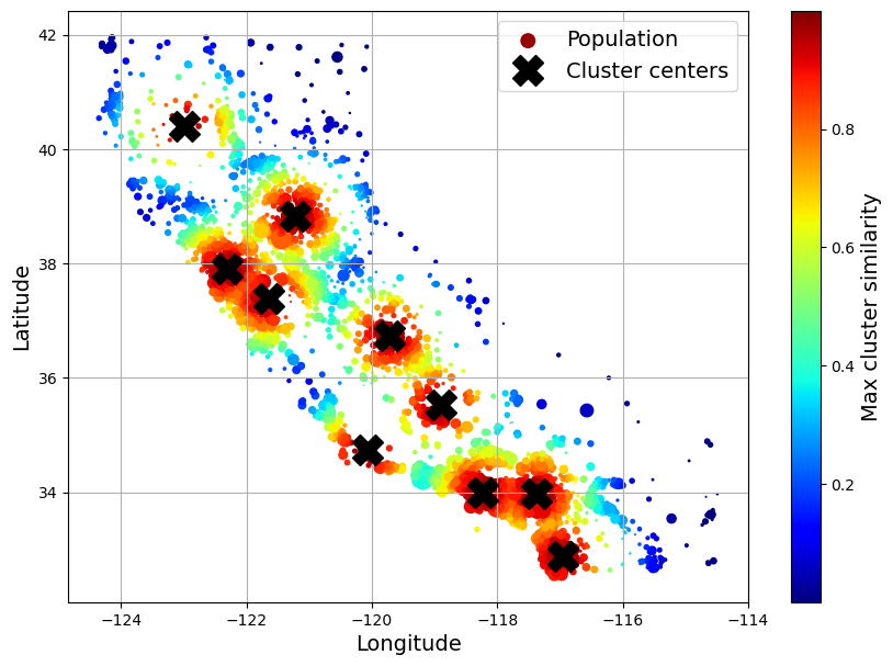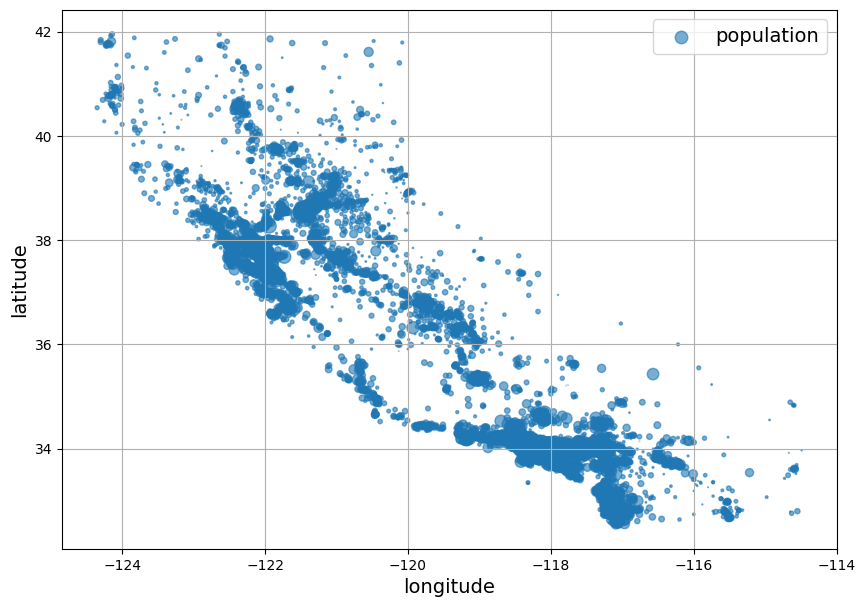훈련셋에 포함된 16,512개 구역의 경도와 위도 정보를 이용하여 구역 정보를 산포도로 나타내면 지역별 인구의 밀집 정도가 다름을 확인할 수 있다. 예를 들어, 일부 지역(샌프란시스코의 Bay Area, LA, 샌디에고 등 유명 대도시)에 인구가 많은 구역이 모여 있는 반면에, 내륙으로 들어가거가 북쪽으로 올라갈 수록 인구 밀도가 낮아지는 경향이 있다.