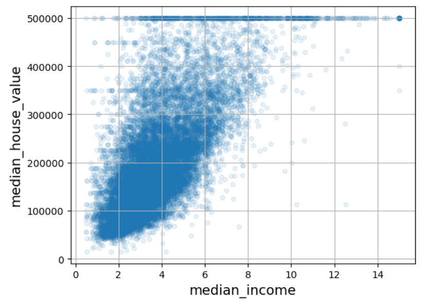 중위 주택가격과 중위소득의 상관계수가 0.68로 상당히 높다. 이는 중위소득이 올라가면 중위 주택가격도 상승하는 경향이 꽤 강하게 있음을 의미한다. 아래 산점도가 이 사실을 잘 확인시켜준다.