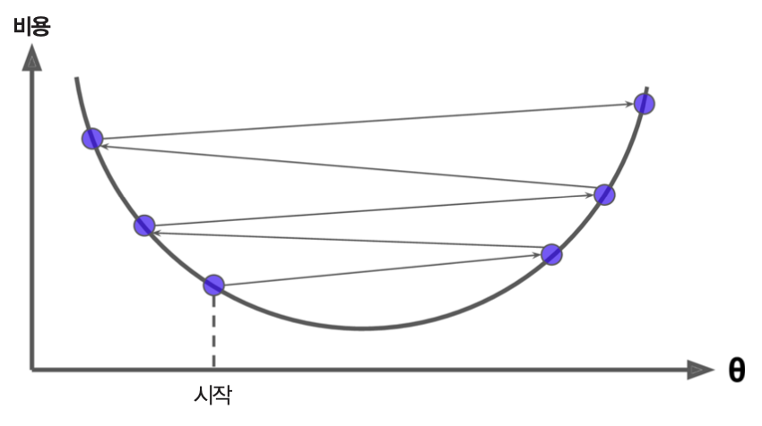 비용 함수가 전역 최소값을 갖도록 하는 에 수렴하지 않고 발산한다.
