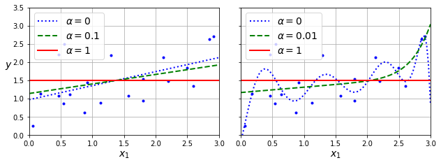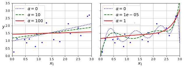 아래 세 이미지는 학습률에 따라 선형 회귀 모델이 최적의 모델로 수렴하는지 여부와 수렴 속도가 달라질 수 있음을 보여준다. 단, 여기서 예제로 사용하는 학습률의 적절성은 모델과 훈련셋에 따라 달라질 수 있음에 주의한다. 보다 상세한 내용은 (코드 워크아웃) 모델 훈련를 참고한다.