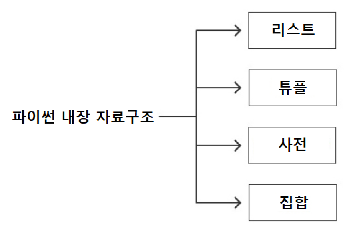아래 그림은 여러 개의 값을 하나의 값으로 묶어 처리할 수 있도록 도와주는 네 개의 내장 자료 구조built-in data structure를 표현한다. 내장built-in은 파이썬이 기본으로 제공한다는 의미다. 반면에 자료 구조data structure는 정수, 부동소수점, 문자열과는 다르게 여러 개의 값으로 구성된 보다 복잡한 값을 표현하는 객체를 가리킨다.